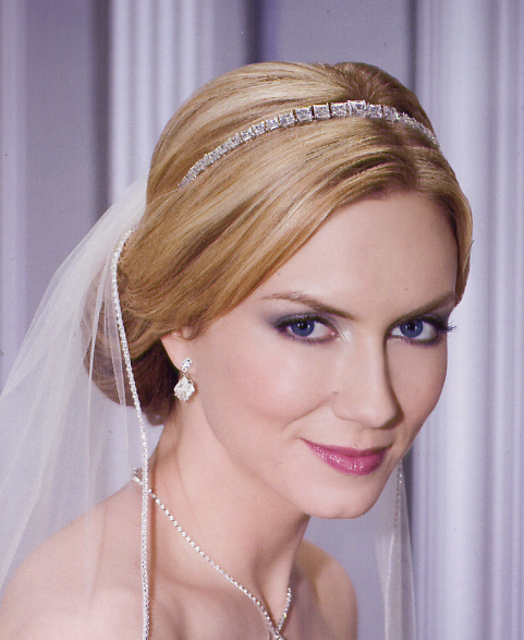 Contemporary headband of square stones. Shown with veil style V8334, sold separately.