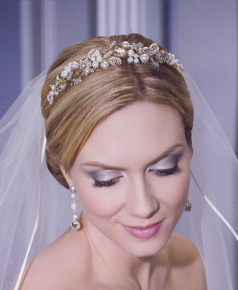 Elegant bandeau of large pearls and stones with filigree accent. Shown with veil style V9999, sold separately.