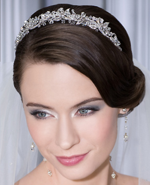 Sparkling tiara of rhinestone motifs accented with crystals. Shown with veils style V8766, and jewelry style J2044, each sold separately.