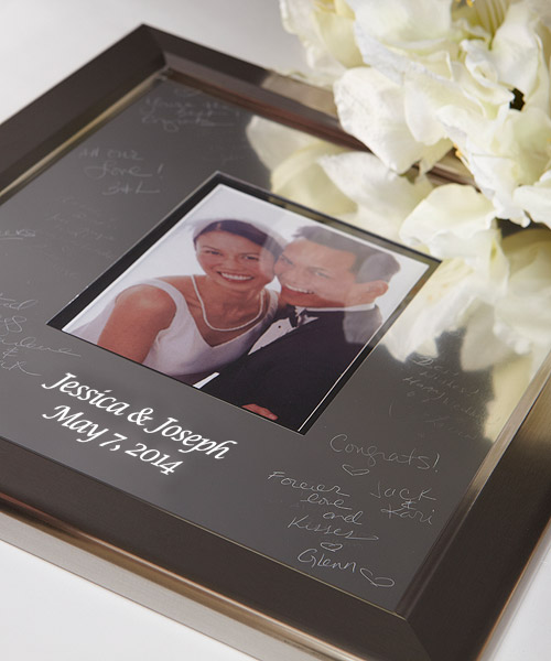 Our Signature Photo Mat is a great alternative to a traditional paper guest book, and something you can proudly display as a keepsake from your wedding day or special occasion. There are no special treatments needed for the mat – just have your guests sign and it is ready to display. Each Framed Keepsake Photo Mat includes one Signature Engraving Scribe, a microfiber polishing cloth to remove finger smudges, and an elegant guest instruction card. After discovering that cardboard signature mats fade in time, this metal guest book mat has been created as a more permanent and decorative option. Your guests will etch their names onto the sturdy, high quality alloy surface with the easy-to-use Engraving Scribe included with each kit. The Titanium finish will never rust or tarnish. Now your photo will be surrounded with personal handwritten messages that can be enjoyed for years to come.